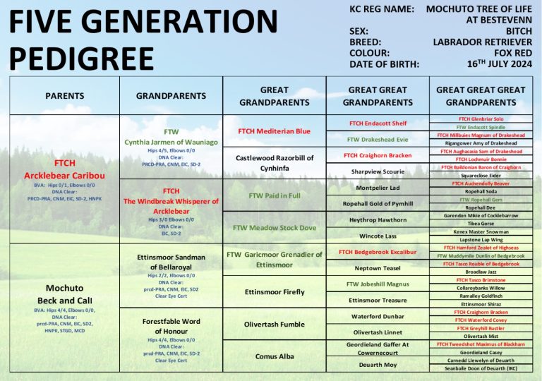 Emmi (Mochuto Tree of Life at Bestevenn) is our lovely fox red girl from the well-respected Mochuto lines, and she has been a joy to have at Bestevenn Labradors. True to her name, Tree of Life, she brings warmth, balance, and vitality to our home and breeding program.